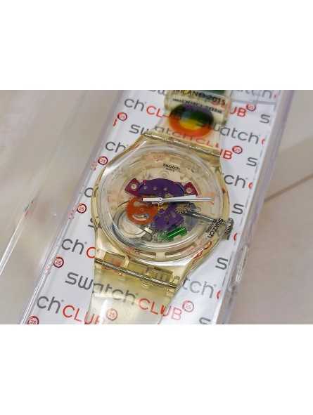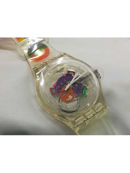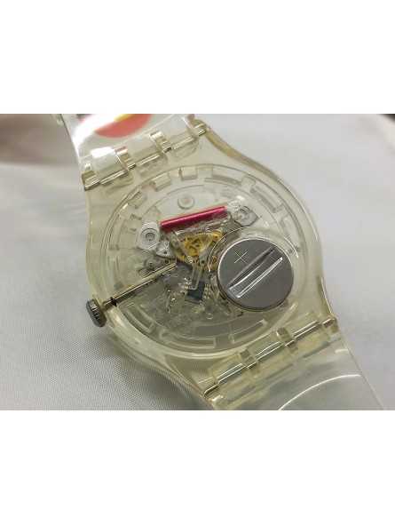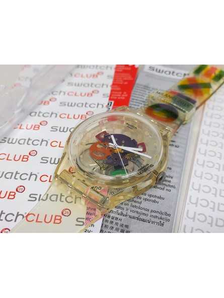 Dotato di una robusta cassa e di un cinturino in silicone Trasparente, questo orologio Swatch